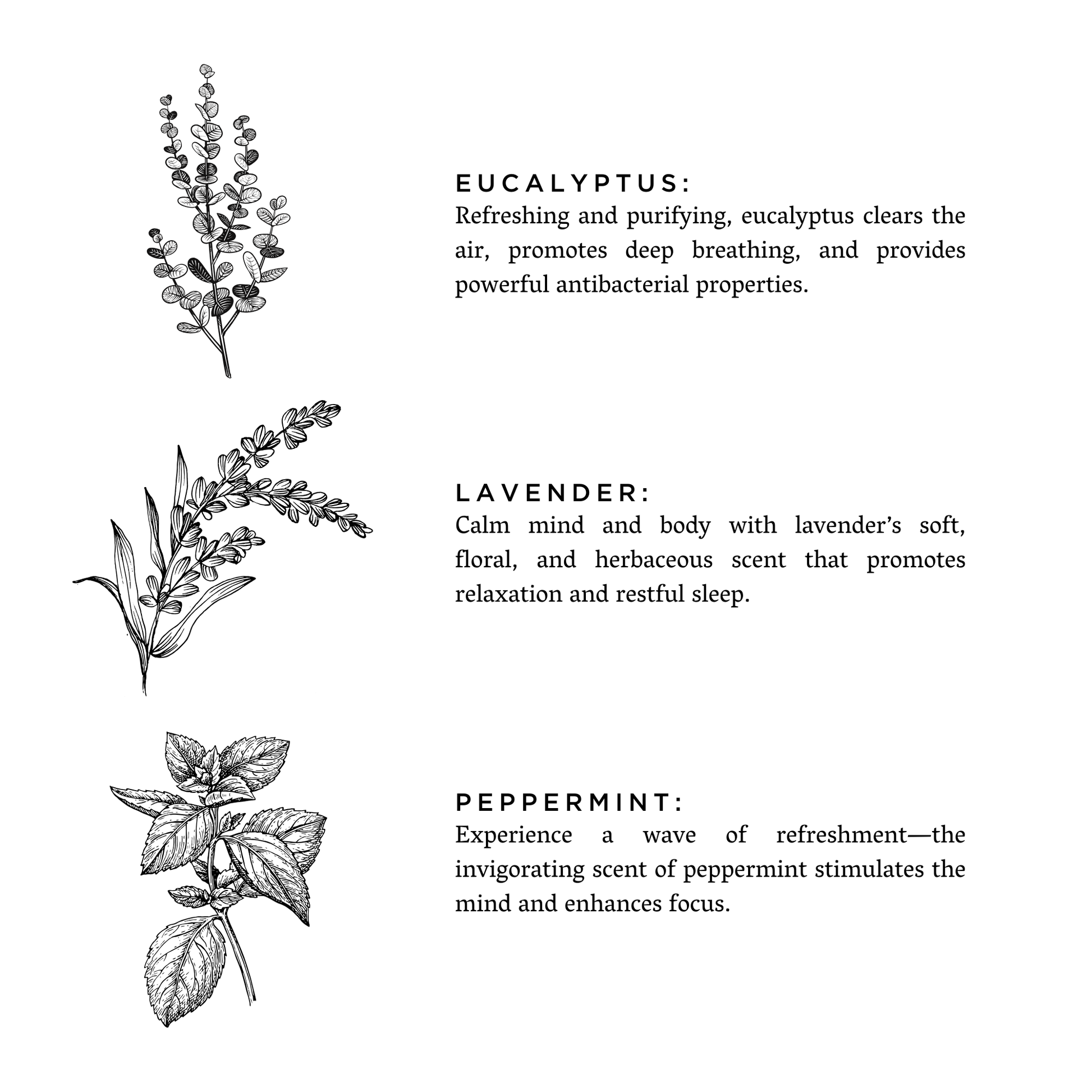 Infused with 100% pure essential oils, the scent profile combines: Lavender: soft and floral, easing stress and calming the senses Eucalyptus: crisp and clarifying, helping open the breath and refresh your space Peppermint: cool and energizing, for a revitalizing finish